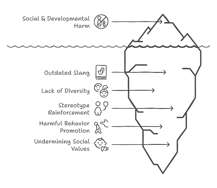 At the negligible level, stories might simply use outdated slang, while minor issues emerge when content lacks diversity in characters or settings. More concerning moderate cases involve consistent reinforcement of gender stereotypes and cultural biases that could shape a child’s understanding of social roles. Major harm occurs when stories actively promote harmful stereotypes or unsafe behaviors, leading children to mimic these problematic patterns. At the catastrophic level, content systematically undermines positive social values, promoting discrimination and distorting children’s understanding of healthy relationships and consent in fundamentally damaging ways.