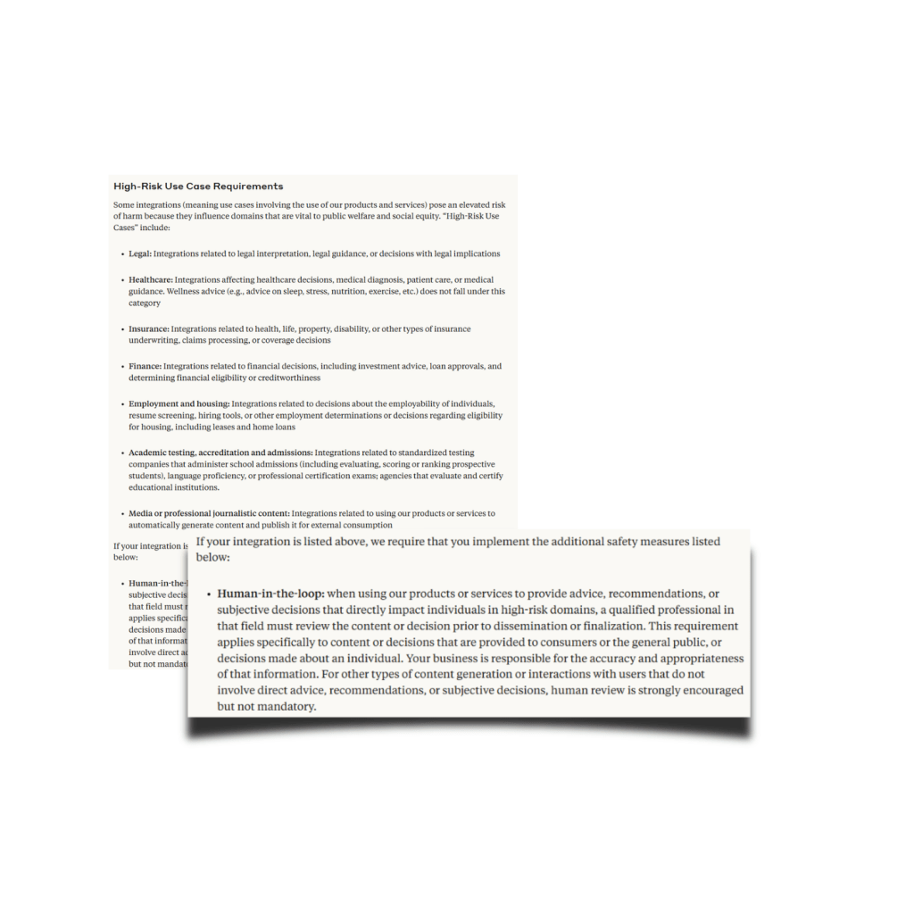 For example, did you know that if you are using any of the models from Anthropic for what they classify as “High-Risk Use Case”, you need to have human-in-the-loop process running in your AI app?