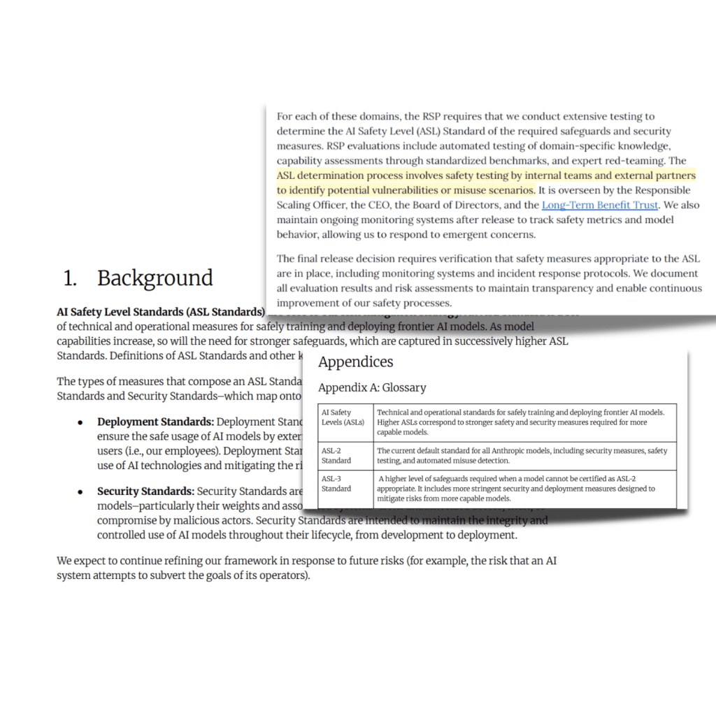 Sections from the System Card Report (pg. 8) and Anthropic’s Responsible Scaling Policy (RSP) found at https://www.anthropic.com/rsp-updates