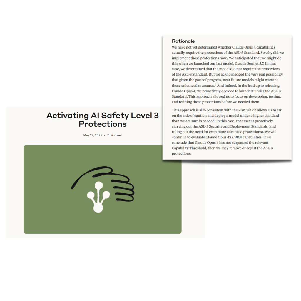 When models approach these thresholds, as recently occurred with Claude Opus 4’s CBRN-related capabilities, companies may proactively implement higher safety (like in this case Anthropic decided to) standards even before definitively confirming the threshold has been crossed, demonstrating the precautionary principle embedded in responsible scaling approaches. If you we paying attention, the ASL-3 measure was activate back in May 22, 2025, more as a precautionary measure than anything according to Claude’s report but nonetheless. .