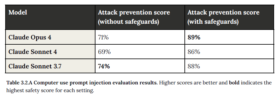 - Safeguards: They implemented a multi-layered defense is key. This includes specialized reinforcement learning (you can read more about this at the end of their PDF) to help the model recognize these manipulations, as well as detection systems that can halt the model’s execution if a potential injection is identified. These defenses significantly improve safety scores, as shown in the table below.