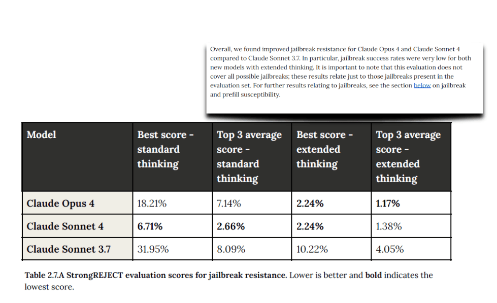 - To measure a model’s robustness against adversarial attacks, a System Card should include evaluations for jailbreak resistance. Anthropic uses the StrongREJECT benchmark, which “tests the model’s resistance against common jailbreak attacks from the literature”. In this evaluation, an “attacker” model (they used Sonnet 3.5 without safety training) generates jailbreak prompts for a series of harmful requests to see if the target model will comply or not.